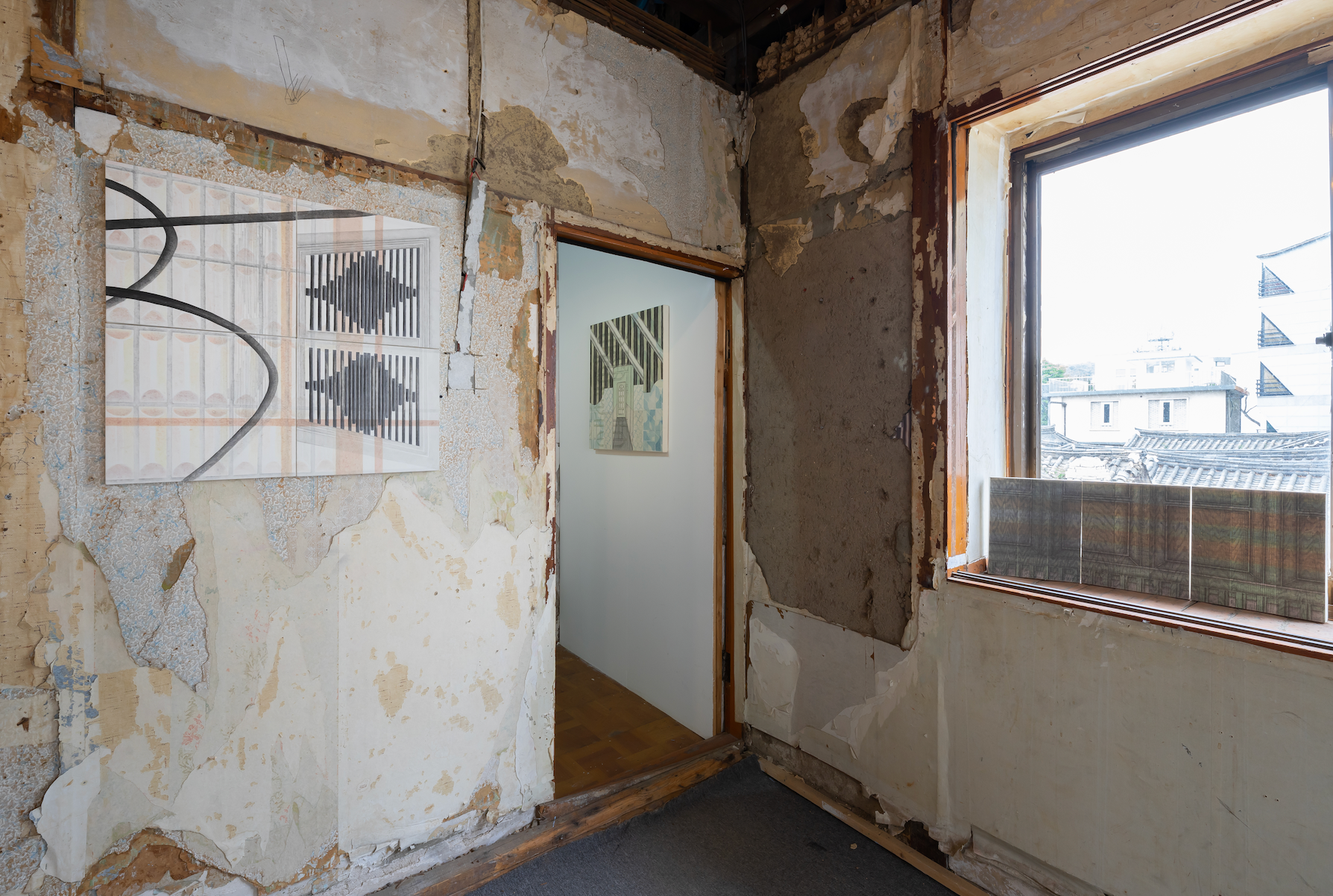 다양한 옅은 색(Color)의 물감을 화판위에 채색하고 말리기를 반복하여 색을 조합하는 방식을 통해 또 다른 공간을 화면 안에 포개어 여러 차원이 드러나도록 하는 것은 과거와 현재가 공존하는 공간을 표현하고자하는 의지였던 것 같다. 어떤 시간을 딱 잘라 구분하는 것 자체가 모순이 아닐까라는 생각은 이러한 방식의 변화로 드러났다. 이런 색의 바탕이 되는 장지는 모든 것을 품어주는 재료이다. 안료가 위로 쌓이는 서양 재료와 다른 스밈의 성격은 그리는 행위자로 하여금 안정감을 주며 머무를 수 있는 자리를 내어주는 공간의 성격과 닮아 있다고 생각한다. 그래서 나는 오래되고 낡은 공간을 좋아하지만 그것을 그대로 그리기보다는 그것이 태어났을 처음을 기억해주며 먼지를 닦아내고 묵은 때를 벗겨낸다. 그리고 그곳이 지닌 색들을 찾아내어 회면에 배치했다.