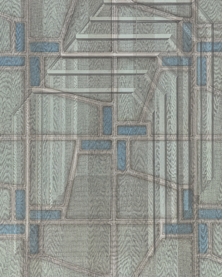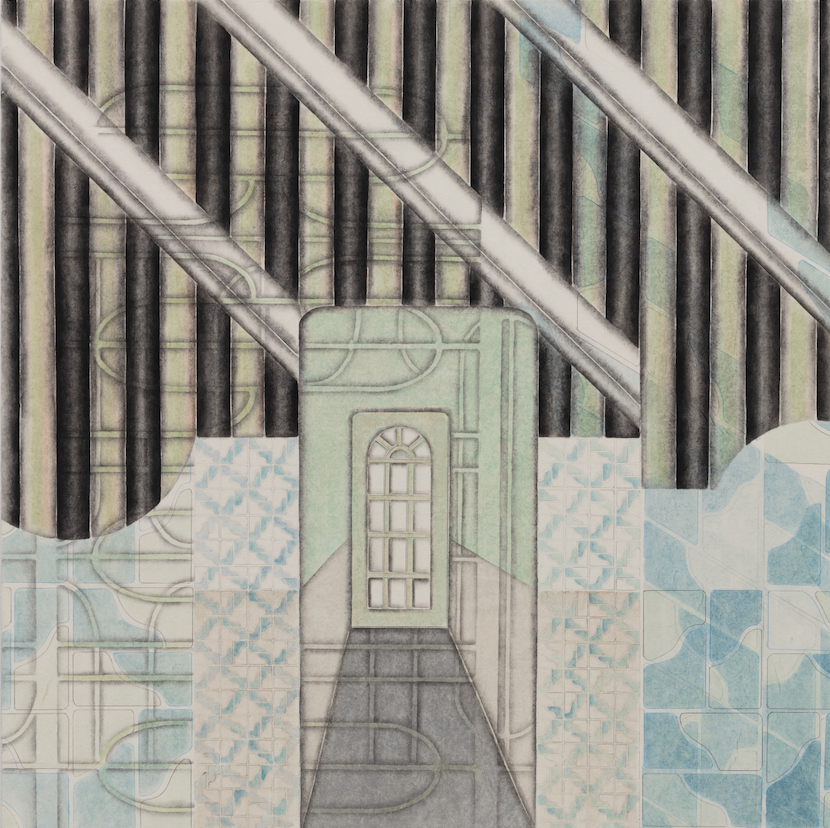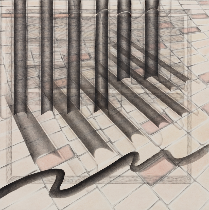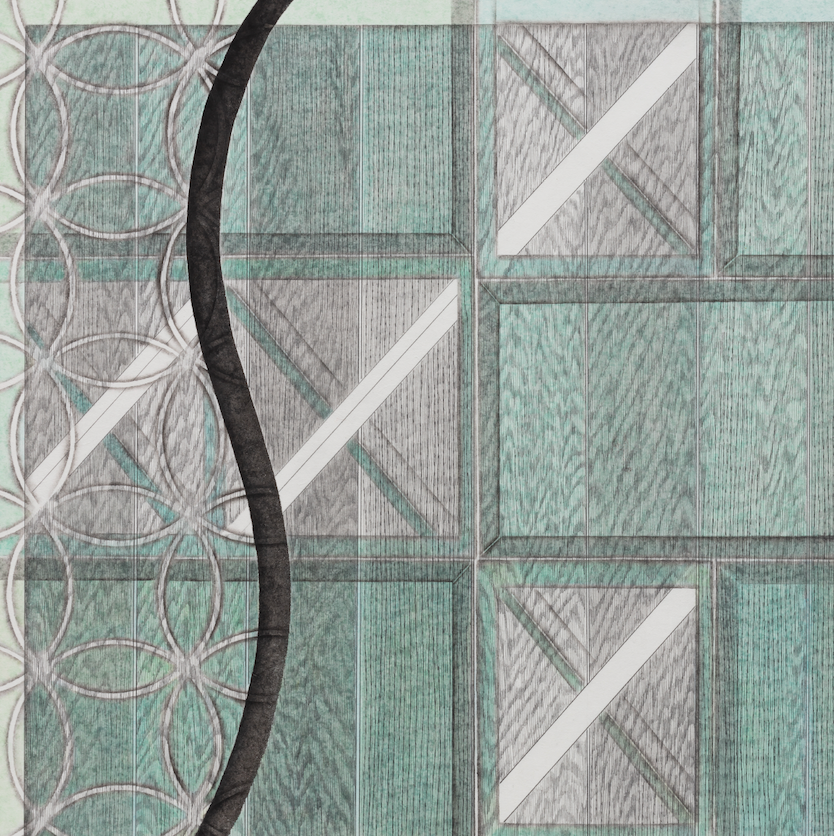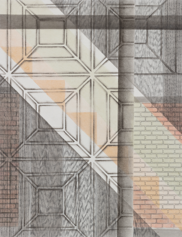 이와는 달리 전시 《외곽》(2021)에서 선보인 작업들은 인공물로부터 추출한 조형적 단서들을 보다 자유롭게 배치하고 이를 임의의 규칙에 따라 재전유하고 있다. 따라서 어떤 구조물은 아주 크게 확대되고 또 다른 부분은 작게 축소되며 추상적 패턴을 형성한다. 나선형 계단의 굴곡, 타일 바닥의 그리드, 창문의 형태와 나무 바닥의 질감은 화면 전면부에 교차되며 나타나므로, 관객은 작가가 제시하는 재현 앞에서 3차원적 감각을 상상하기보다는 일상적 단상들이 직조하는 시각적 리듬을 읽어내는 데 집중하게 된다. <Mosaic Tile>(2019)이나 <Curve>(2021) 연작의 경우 세밀하게 배치된 기하학적 형상의 조합이 만들어내는 균형과 긴장, 속도감 등이 도드라지는 것을 볼 수 있다. 이러한 형식 상의 변화는 실제 작가의 관찰 시점과 감정적 상태, 또 도시를 체화하는 방식이 점진적으로 이동했다는 것을 이야기한다. 즉 이는 작가가 때로는 원거리에서, 또 때로는 근거리에서 현실에 몰두하며 공간과 신체 사이의 거리를 적극적으로 조율하기를 멈추지 않는 자세가 반영된 결과이다.