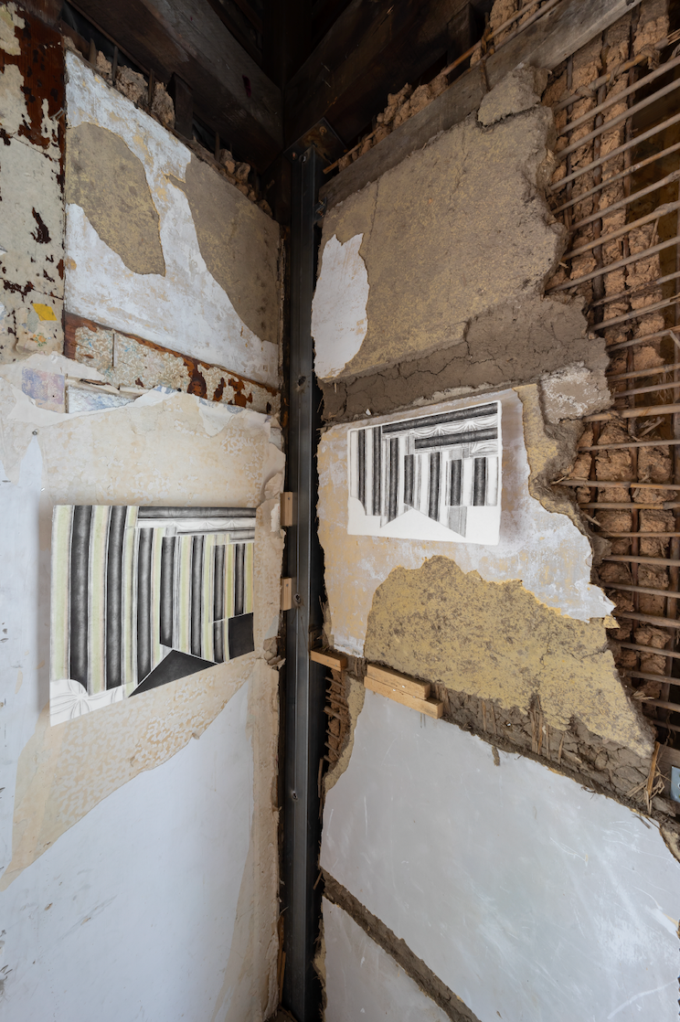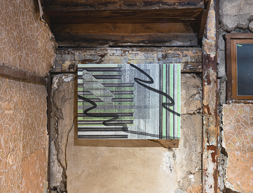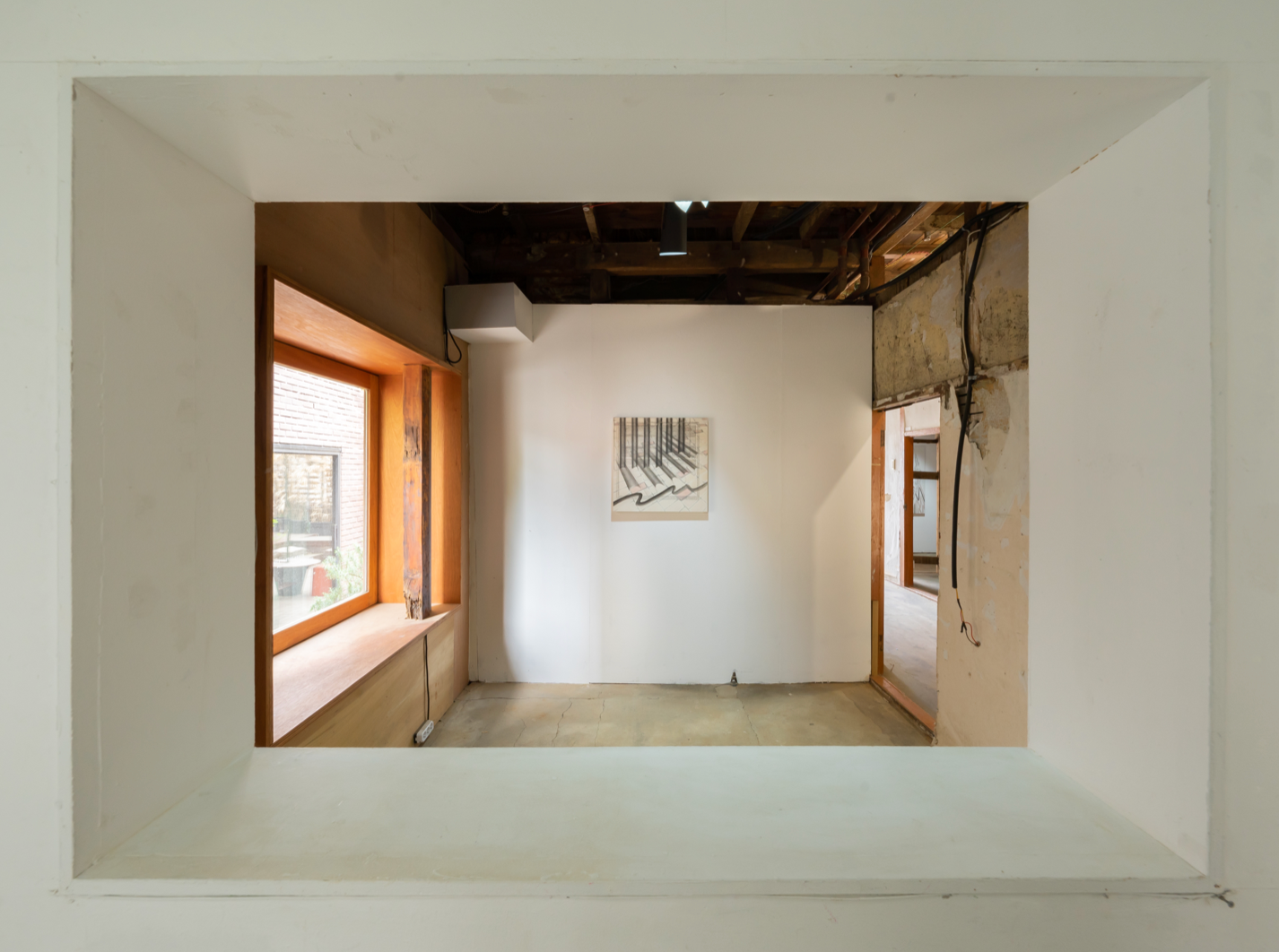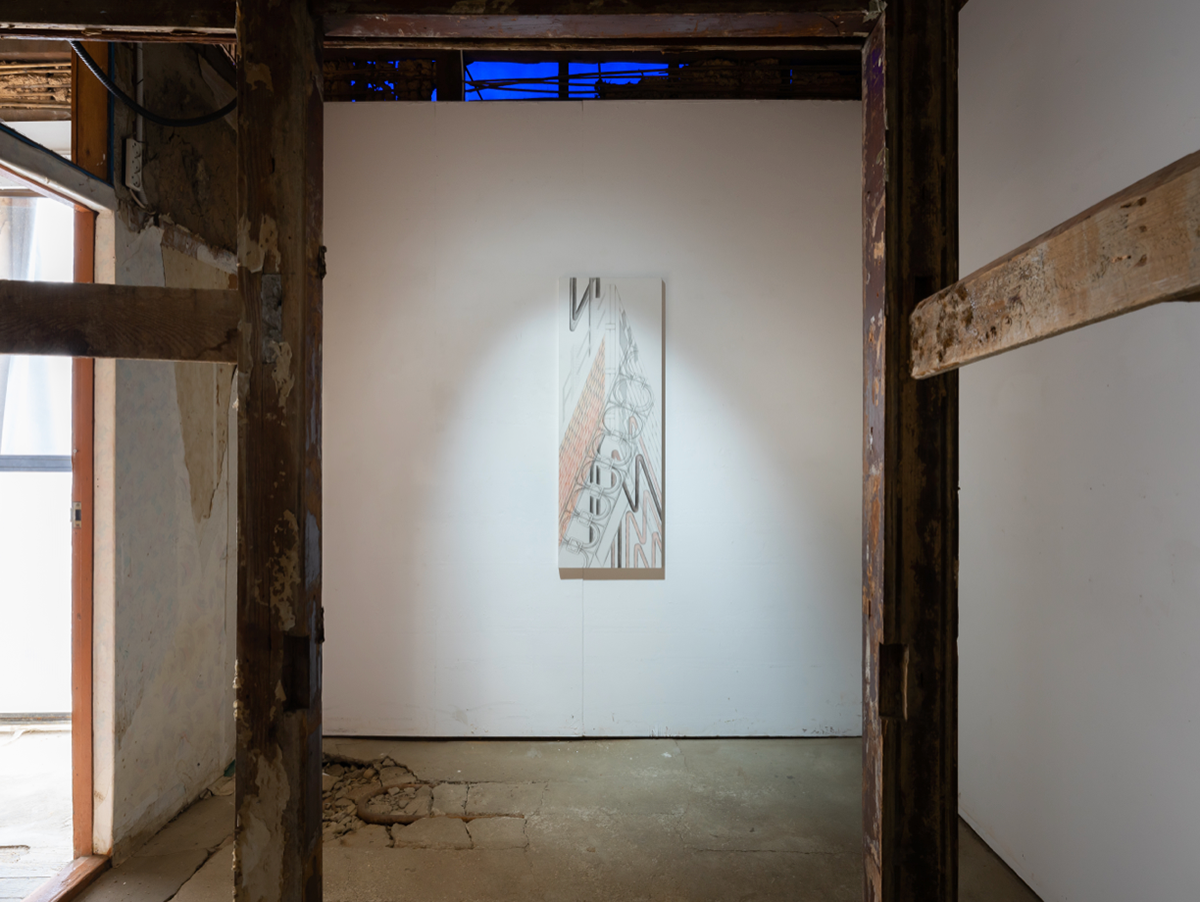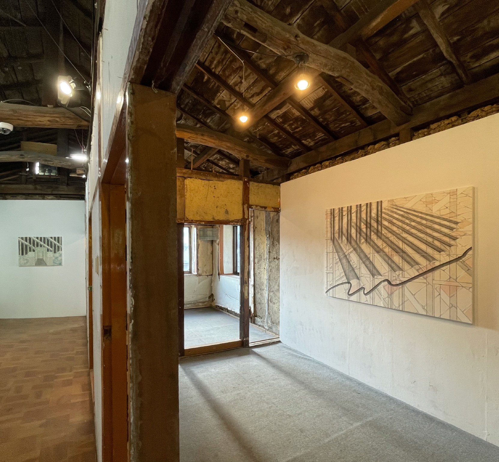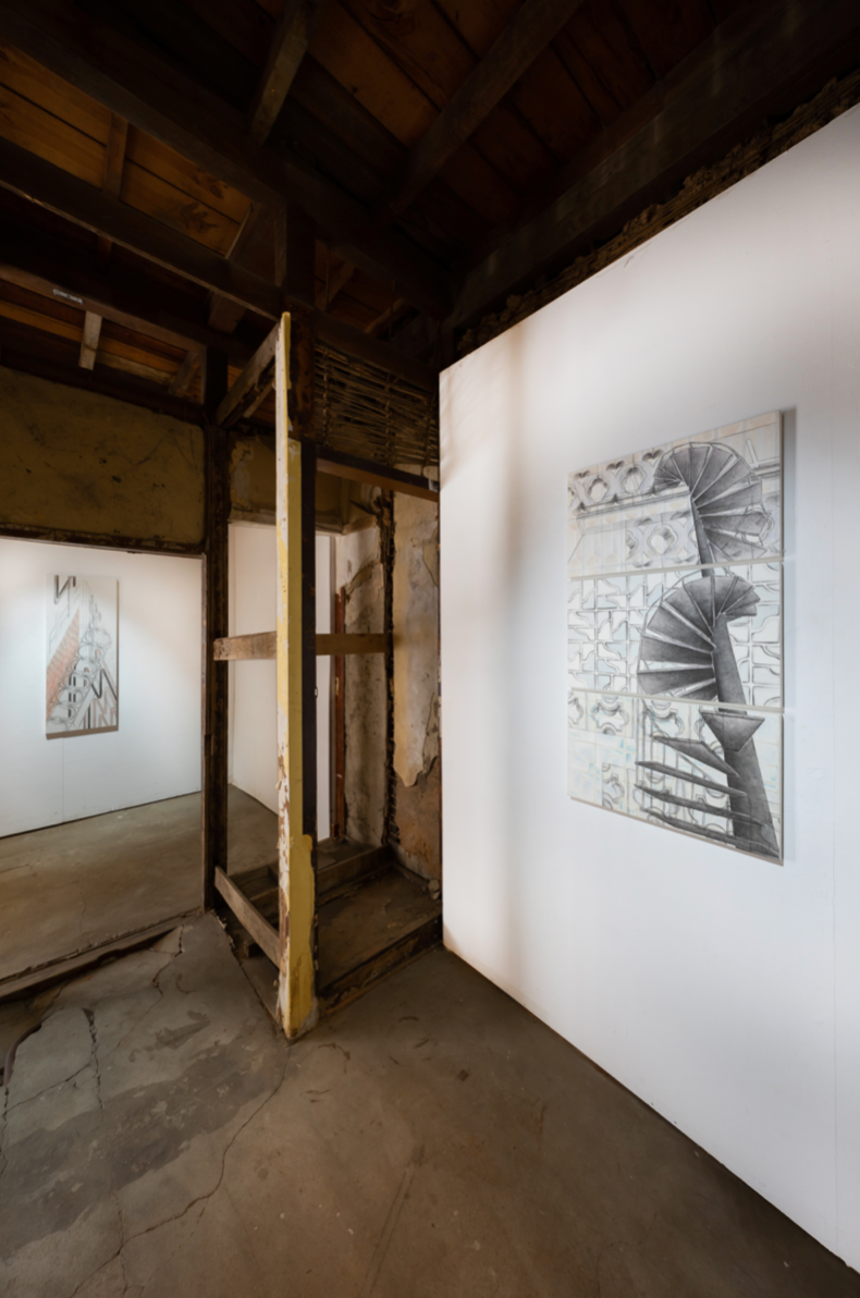 이러한 맥락에서 그의 작품이 함의하는 바를 상기해보면, 작가가 여러 곳을 오가며 얻었던 주관적 감각이 엮여 완성된 그림들은 많은 이들의 조각난 시간들이 모여 교차하는 여관의 상징적 의미와 연동될 가능성을 점쳐볼 수 있다. 필자는 전시장에서 작품의 일부가 실제 장소와 긴밀하게 엮여 새로운 해석의 확장 가능성을 제시하는 몇몇 순간을 만날 수 있었다. 가령 전시장의 계단 난간의 비탈진 선은 <Window>(2021)의 굵은 선들의 연장선이 되어 사람이 오르내리는 이동 방향을 떠올리게 하고, 역으로 작품이 여관의 비어있는 골조를 채워주고 있는 모양새로 보이기도 한다. 줄지어 선 <Balcony Drawing>(2021)는 그림을 감싼 유리면이 여관의 풍경을 흡수하며 그림 위에서 어른거리는 반영(反影)이 된다. 두꺼운 선들의 반복적 배치가 도드라지는 <Curve 3>(2021)은 여관 지붕을 받치는 서까래의 그림자가 되어주고 있었다. 작품은 공간의 배경으로서 기능하기도 하고 독립적인 체계로서 스스로 목소리를 내기도 하며 《외곽》이라는 한 편의 시나리오를 그려 나간다.