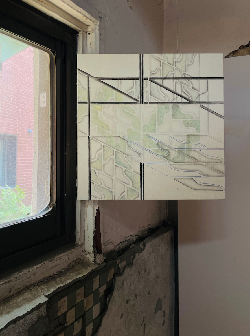 선과 색이 만나 이루는 면의 배치는 건물을 둘러싼 외벽, 발코니, 창문, 지붕 등의 구조에서 가져왔다. 선택되어진 공간은 그곳을 이루는 선들의 움직임을 따라 시선이 세로의 직선, 가로의 직선, 대각선, 곡선, 원의 둥근 선 등 공간이 지닌 틀에 관한 기준선이 존재했다. 이 기준선은 바라본 작가의 시선이 되어 화면의 변주를 주는 시작점이 되어준다. 오래된 건물에 겹겹이 쌓인 벽돌위에 타일, 타일 위에 페인트라는 층위들은 시간의 누적을 보여준다 생각했고, 그것을 화면으로 가져오며 그곳이 지닌 선과 면의 기준선을 통해 화면을 분할하고 색의 배치를 고민해보았다. 과거의 작업들은 무엇을 어떻게 하면 그림이라는 것을 시작할 수 있을까에 집중한 그림들이라면 최근에는 어떻게 그려내야 할지에 더 집중한다.