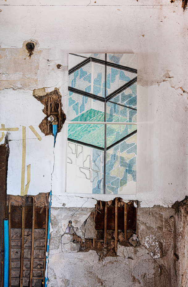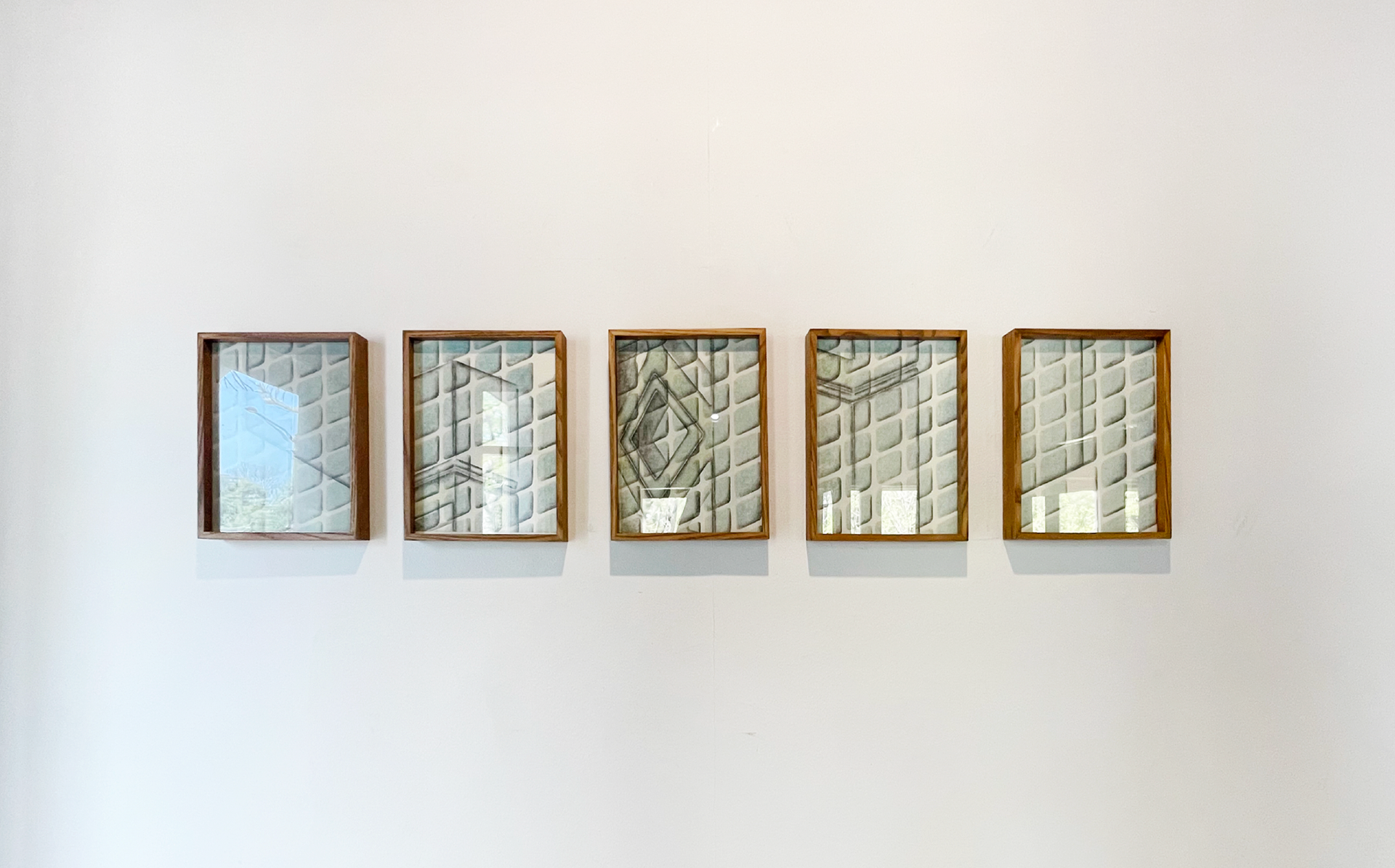 Unlike this, her pieces displayed at the exhibition 《Frame》(2021) more freely arrange artistic clues extracted from artifacts and reappropriate them in accordance with arbitrary regulations. Thus, some abstract patterns shaped as structures are extended while others are reduced. As the curves of spiral stairs, grids on the tile floor, shapes of windows, and texture of the wooden floor appear crossed, the viewer comes to concentrate on interpreting visual rhythms arising from quotidian stray thoughts rather than picturing some three-dimensional sensation before a reproduction presented by the artist. The sensation of speed, balance, and tension brought forth by a combination of minutely placed geometric forms stands out in series such as 〈Mosaic Tile〉(2019) and 〈Curve〉(2021). This formal change implies that there has been a gradual shift in the artist's viewpoint, emotional state, and way of internalizing the city. That is to say, this is the result that reflects her striving aggressively to adjust the distance between space and body, occupying herself in observing reality seen in a long shot or in close-up.