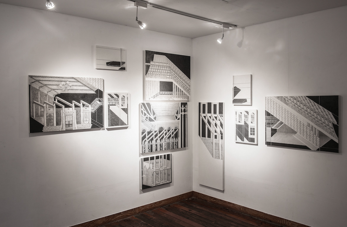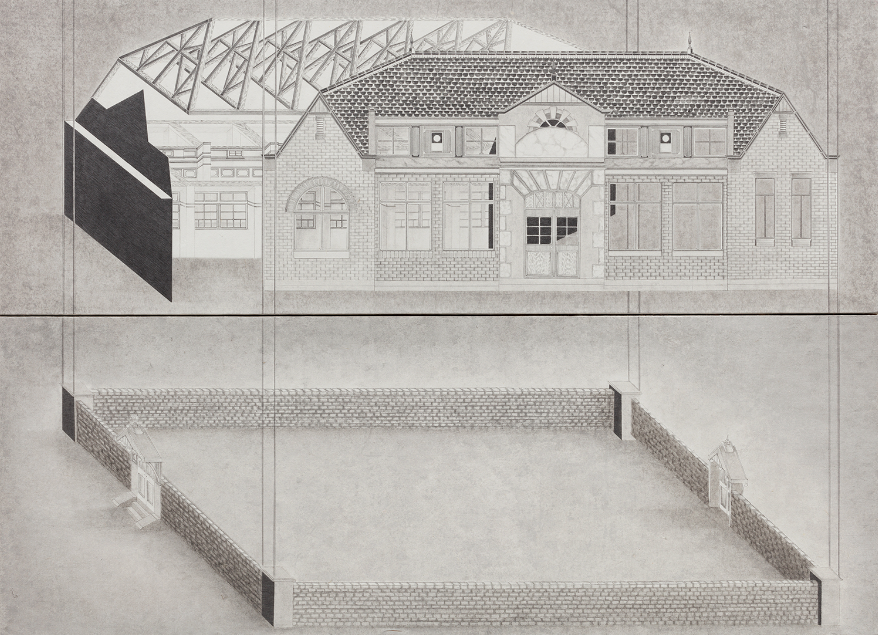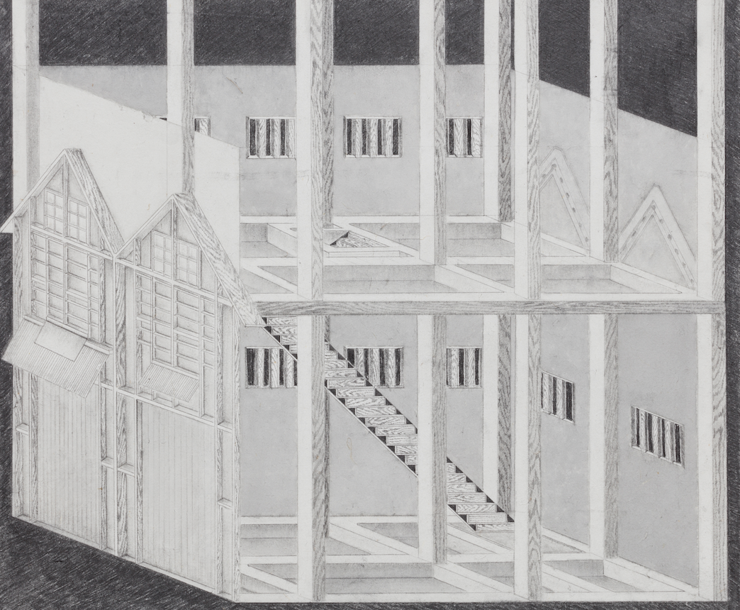 그리고 작가는 그 고독을 그린다. 건물의 고독을 그리고, 역사의 고독을 그리고, 유년시절에서 되불러온 존재의 고독을 그린다. 외관상 건물 내부를 투시해보는 습관과 능력을 발휘해 건물을 그리지만, 사실은 건물에 스민 고독을 그린다. 장지에다가 샤프펜슬을 꼭꼭 눌러 그리는데, 그걸 작가는 촉각치라고 부른다. 보면서 만지는(보는 것이 곧 만지는 것인), 보면서 더듬는, 보면서 더듬어 찾는, 역사적 현실(다르게는 시간)을 복원하고 기억을 재생하는 작가만의 방법이다. 그렇게 복원된 건물구조에서 설계도와 같은 건물의 원형이 복원될 것이라고 생각할 필요는 없다. 작가는 건물을 그리는 것이 아니라 건물에 스민 시간을 그리고 고독을 그리고 공허함(공실)을 그리는 것이니까. 그렇게 작가는 어쩌면 사실은 유년시절 미미에게 그랬던 것처럼 자신에게 마련해 줄 뒤늦은 집(존재의 집)을 짓고 있는지도 모른다.