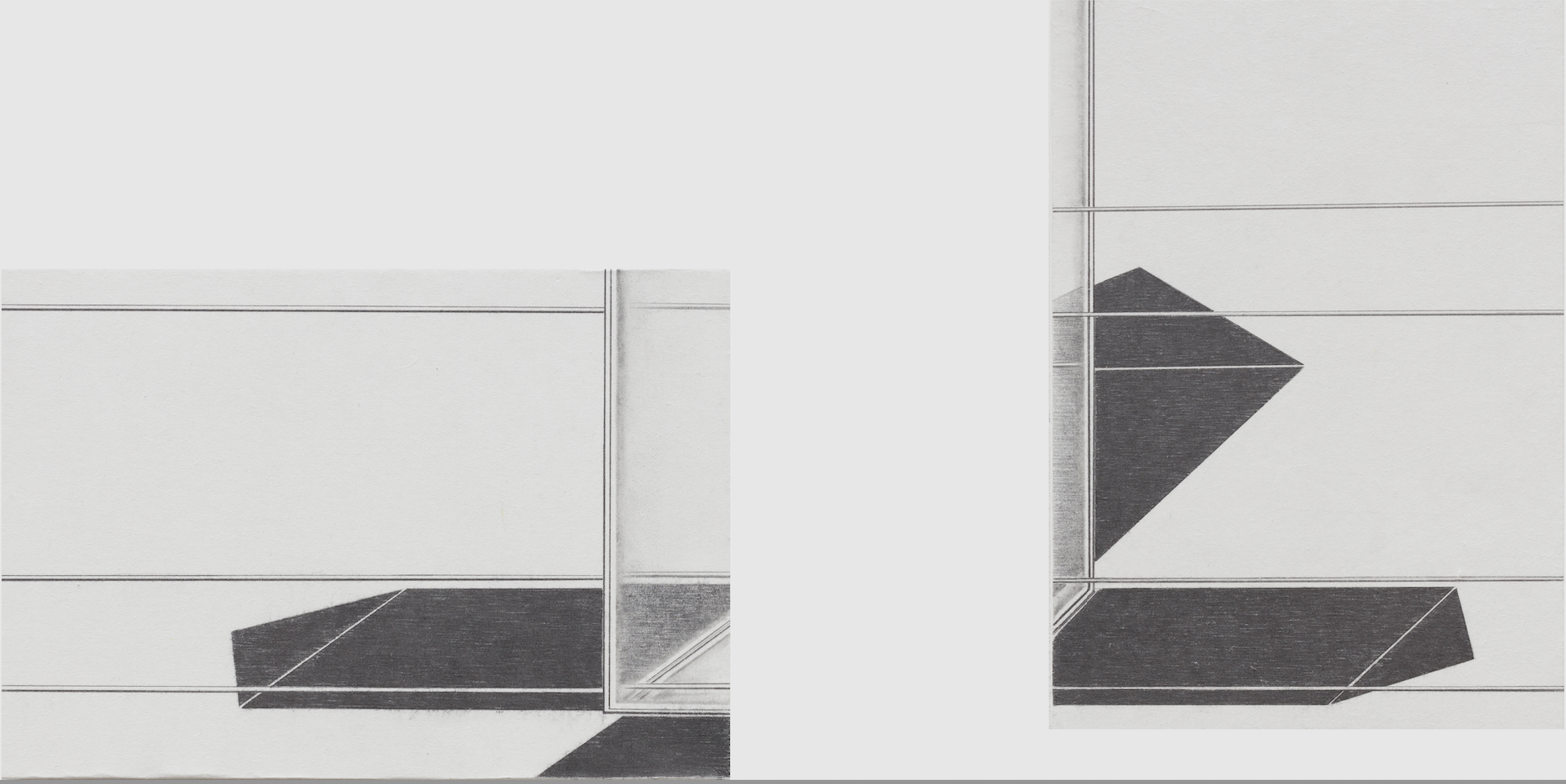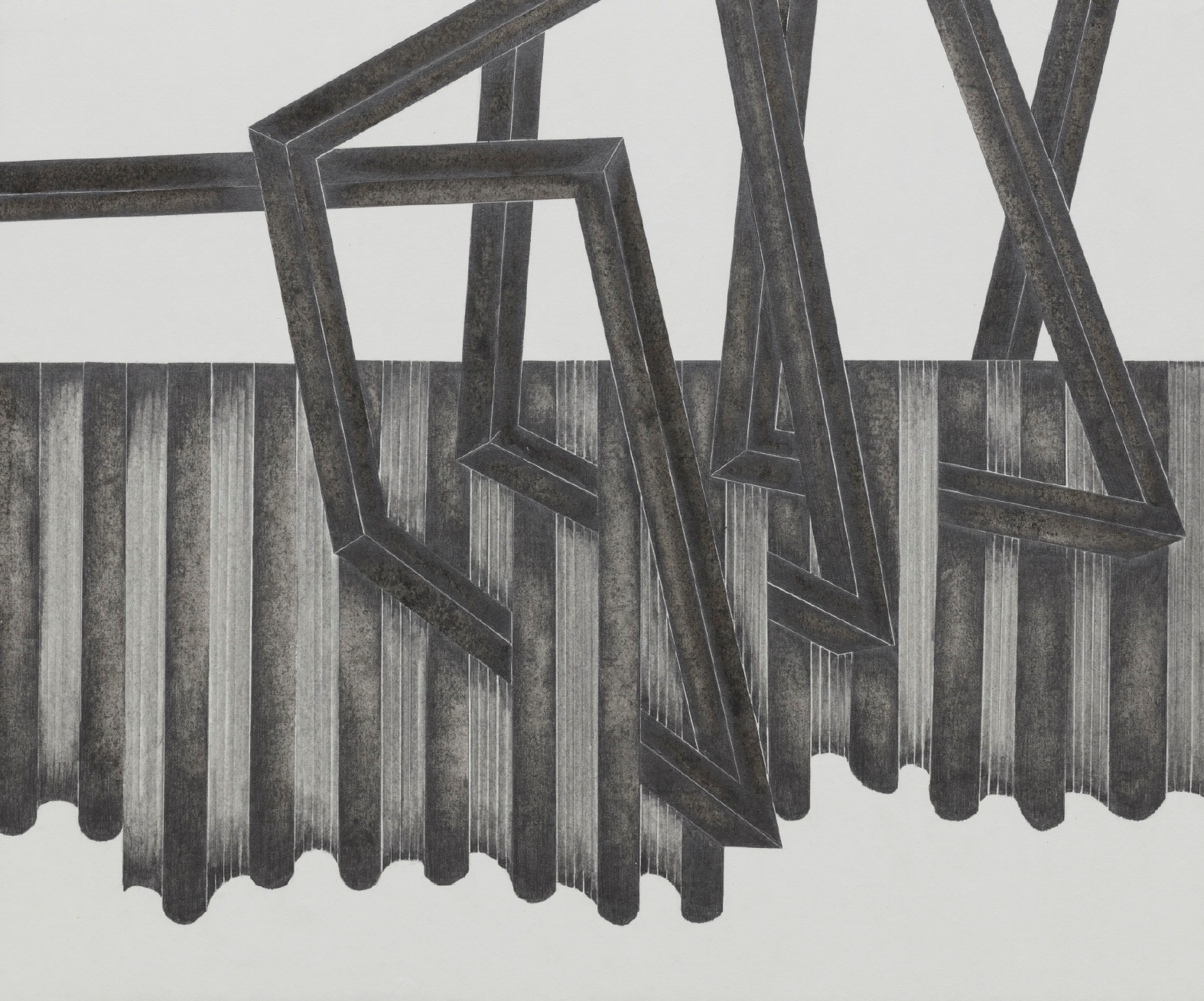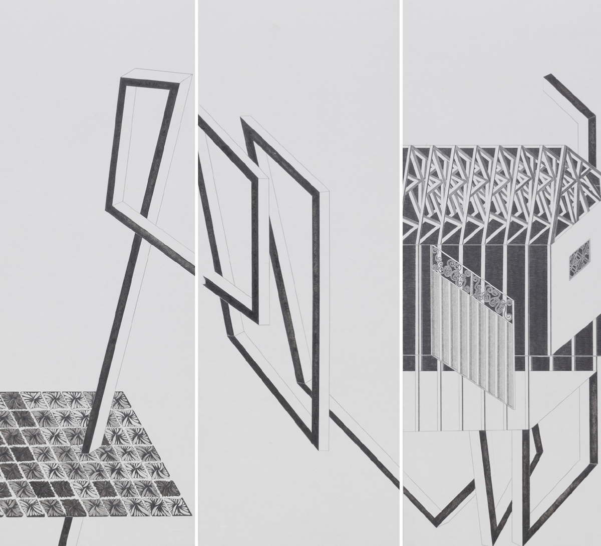 그리고 작가는 그 고독을 그린다. 건물의 고독을 그리고, 역사의 고독을 그리고, 유년시절에서 되불러온 존재의 고독을 그린다. 외관상 건물 내부를 투시해보는 습관과 능력을 발휘해 건물을 그리지만, 사실은 건물에 스민 고독을 그린다. 장지에다가 샤프펜슬을 꼭꼭 눌러 그리는데, 그걸 작가는 촉각치라고 부른다. 보면서 만지는(보는 것이 곧 만지는 것인), 보면서 더듬는, 보면서 더듬어 찾는, 역사적 현실(다르게는 시간)을 복원하고 기억을 재생하는 작가만의 방법이다. 그렇게 복원된 건물구조에서 설계도와 같은 건물의 원형이 복원될 것이라고 생각할 필요는 없다. 작가는 건물을 그리는 것이 아니라 건물에 스민 시간을 그리고 고독을 그리고 공허함(공실)을 그리는 것이니까. 그렇게 작가는 어쩌면 사실은 유년시절 미미에게 그랬던 것처럼 자신에게 마련해 줄 뒤늦은 집(존재의 집)을 짓고 있는지도 모른다.