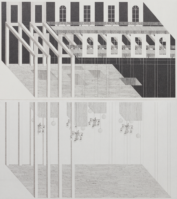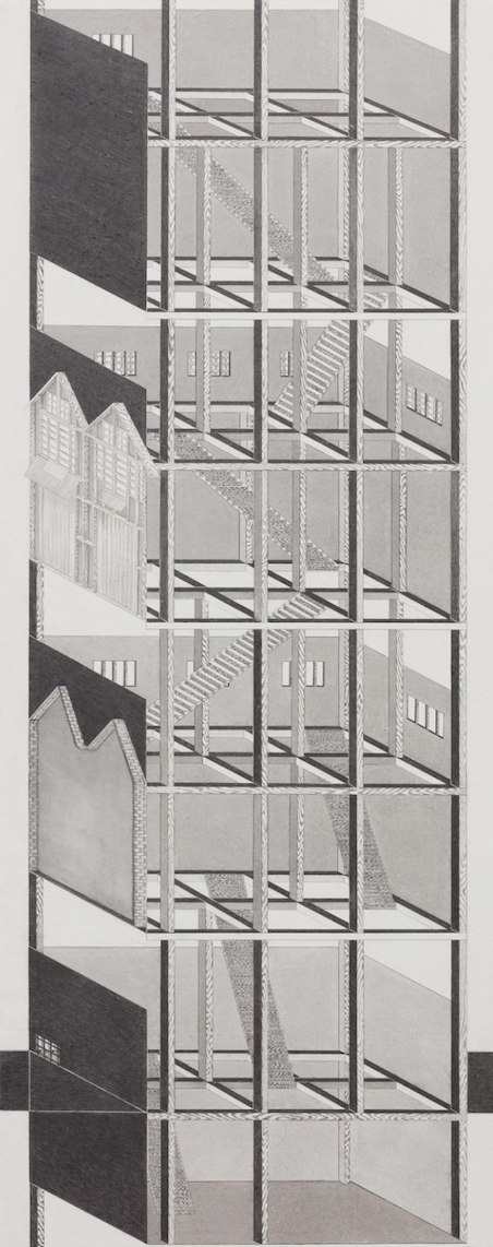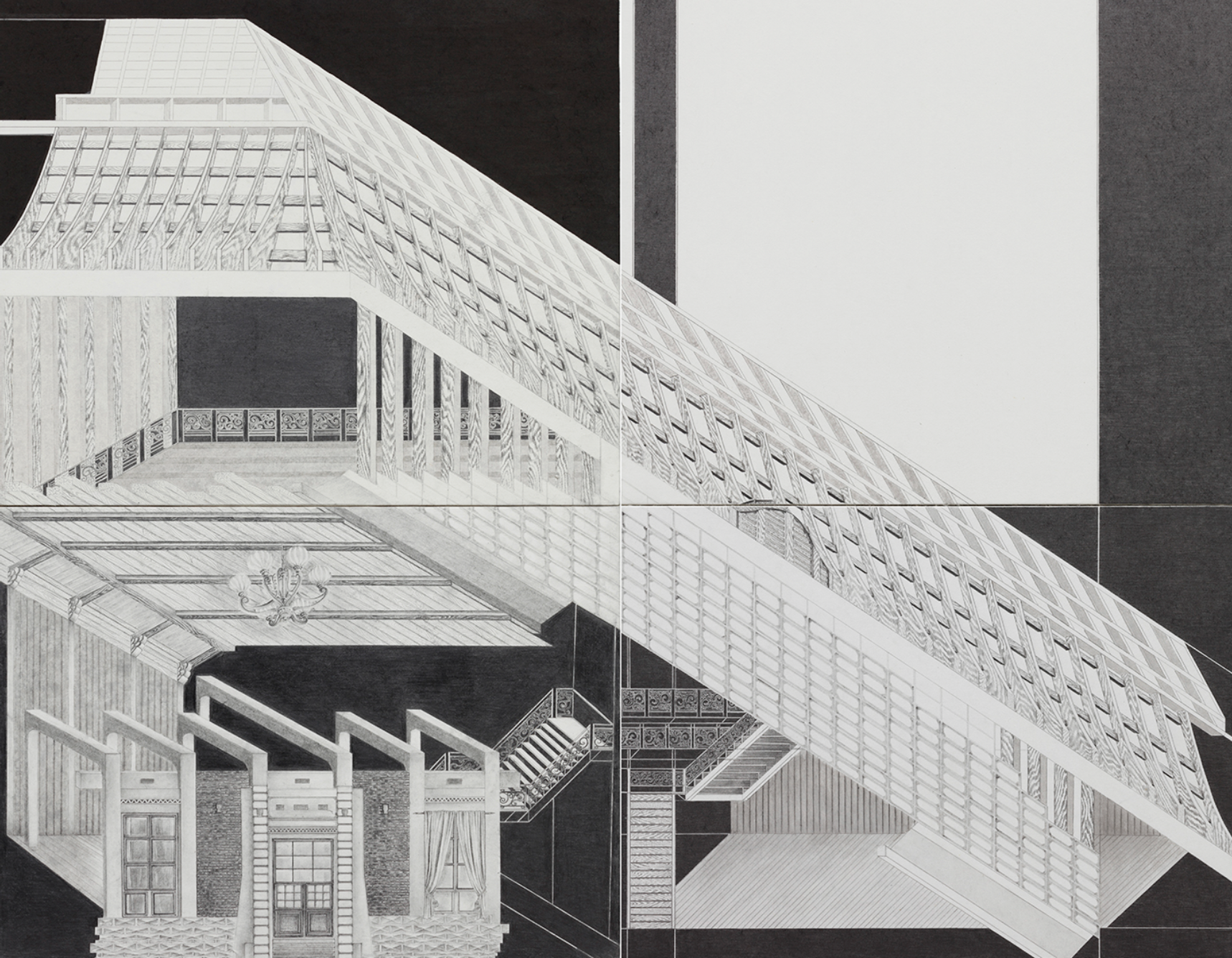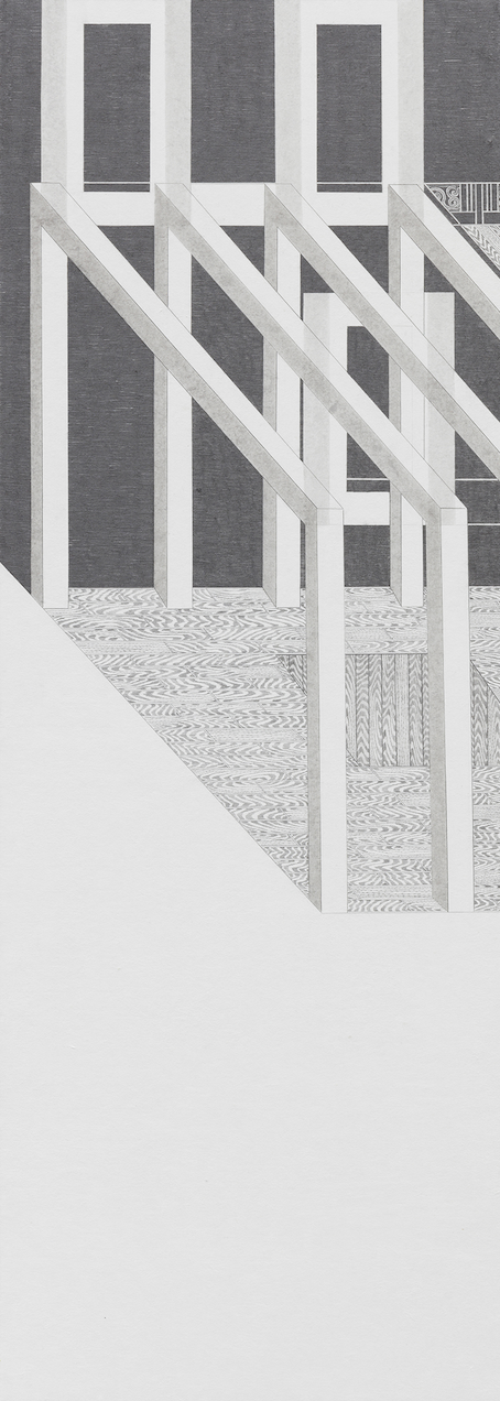 Using historical materials of real spaces, modern buildings that seem to exist yet almost do not appear are depicted on the canvas through a merging of their appearances in archival records and their present state, or through fragmentation, deconstruction, and reconstruction. The resulting imagery is divided between focused and unfocused perspectives, forming distinct lines of sight, demonstrating an expansion toward a peripheral vision—where everyone is central, yet no one is central.